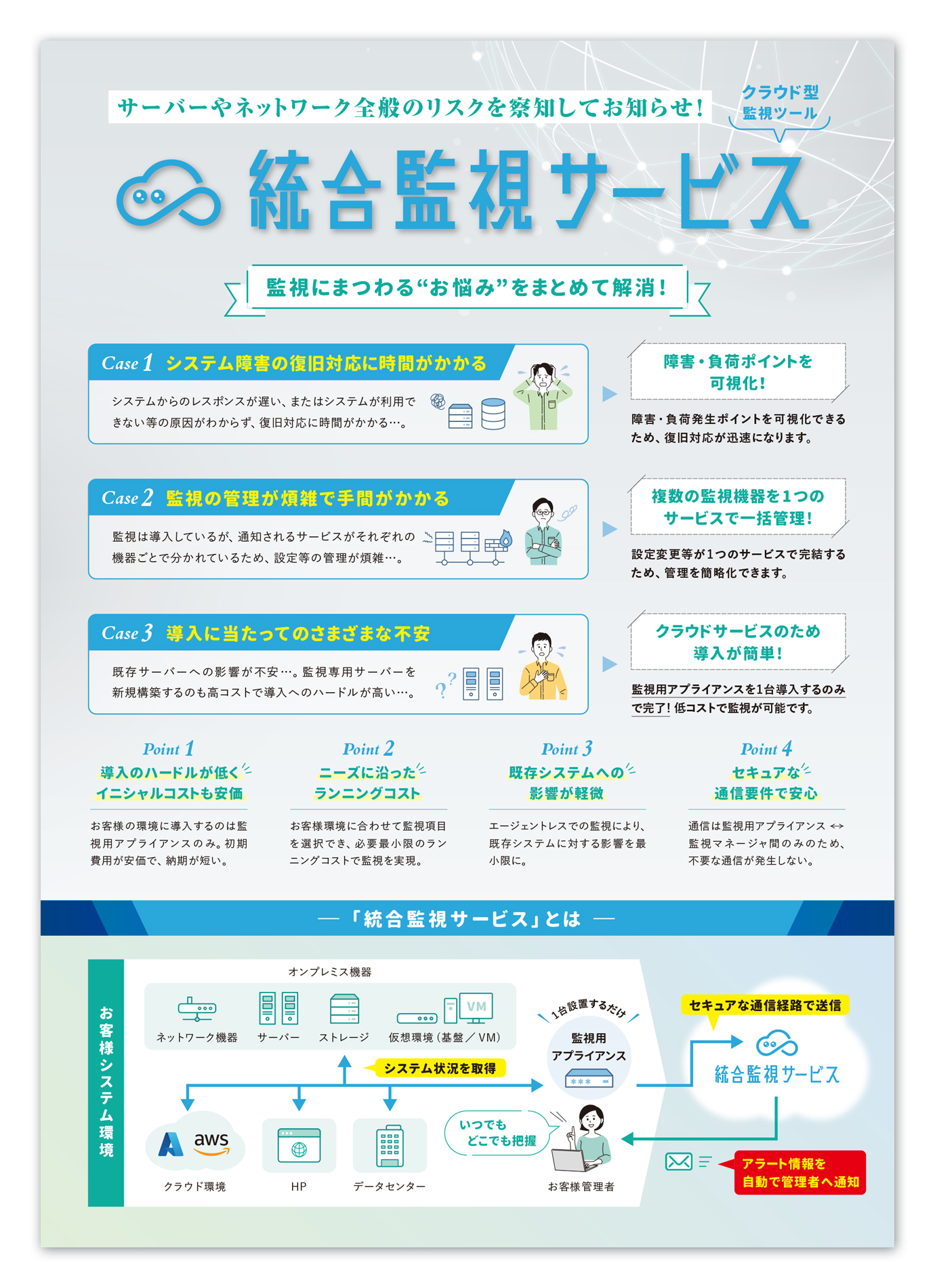 従来のWEB・IT系にありがちなフレア・光(ライト)などを多用するデザインではなく、シンプルに分かり易く可読性に優れたデザインを採用。また、中小企業のシステム担当者をターゲットにしておりイラスト・アイコンを所々にアイキャッチとして展開したデザインでサービス内容を理解しやすいデザインに仕上げている。